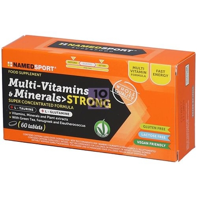 Multi-Vitamins & Minerals >STRONG SUPER CONCENTRATED FORMULA Descrizione Integratore alimentare multivitaminico e multiminerale a base di vitamine C, E, B1, B6, acido pantotenico, L-glutamina, L-taurina, magnesio, manganese, cromo, rame e zinco, con estratti vegetali di fieno greco, tè verde ed eleuterococco, utile per contribuire alla riduzione di stanchezza e affaticamento, alla protezione delle cellule dallo stress ossidativo e a svolgere un'azione antiossidante. Ingredienti Agente di carica: cellulosa; ossido di magnesio, rosa canina addizionata di vitamina C (Rosa canina L., falso frutto e.s., acido L-ascorbico) tit. 70% in vitamina C totale, fieno greco (Trigonella foenum-graecum L.) semi e.s., tè verde addizionato di caffeina (Camellia sinensis L. Kuntze foglie e.s., caffeina) tit. 40% in polifenoli e 12% in caffeina totale, eleuterococco (Eleutherococcus senticosus Rupr. et Maxim. Maxim) radice e.s. tit. 0, 8% in eleuterosidi, taurina, vitamina E (DL-alfa tocoferile acetato), L-glutamina, zinco solfato monoidrato; agenti antiagglomeranti: sali di magnesio degli acidi grassi, biossido di silicio; manganese carbonato, rame gluconato, acido pantotenico (calcio D-pantotenato), vitamina B6 (piridossina cloridrato), vitamina B1 (tiamina cloridrato), cromo picolinato. Caratteristiche nutrizionali Valori medi Per 2 compresse%VNR* Magnesio 120 mg 32 Taurina 76 mg-Vitamina E30 mg 250assunzione di 2 compresse al giorno. Avvertenze Non superare la dose giornaliera consigliata. Tenere fuori dalla portata dei bambini al di sotto dei 3 anni di età. Gli integratori alimentari non vanno intesi come sostituti di una dieta variata ed equilibrata e di uno stile di vita sano. Conservazione Conservare a temperatura ambiente in luogo fresco e asciutto. Validità a confezionamento integro: 36 mesi. Formato Astuccio da 60 compresse. Cod. V107