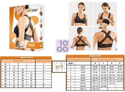 EKEEP B1 POSTURAL BRA Descrizione Reggiseno posturale, versione bianca, indicato nei casi di: -sindrome da mal allineamento posturale; -sindrome posturale dolorosa; -dorso curvo da ipercifosi; -correzione posturale durante l'attività sportiva e"idiana. Tessuto ultrasottile aerato, leggero, traspirante, fresco, Wash& Wear, senza ferretti, chiusura anteriore a gancetti. Con sistema di tensionamento a 4 punti di ancoraggio e 2 tiranti ad incrocio dorsale. Con fascia inferiore in tessuto elastico confortevole. Composizione Corpo maglia: 75% poliammide, 25% elastan. Fasce: 60% poliammide, 30% poliestere, 10% elastan. Modalità d'uso Indossare il prodotto come un normale reggiseno utilizzando la chiusura anteriore a gancetti. Tendere i tiranti regolabili sino ad ottenere l'effetto di retropulsione desiderato. Fissare le estremità dei tiranti nelle apposite aree di velour. Lavaggio: lavare a mano in acqua a 30°C o in lavatrice nell'apposito sacchetto, con sapone o detersivo neutri, sciacquare bene, lasciare asciugare orizzontalmente. Non stirare. Informazioni sulle taglie 1. Prendere la misura della circonferenza sottoseno. 2. Prendere la misura della circonferenza del seno. Le due misure devono essere riferite alla stessa riga. · Misurazione A