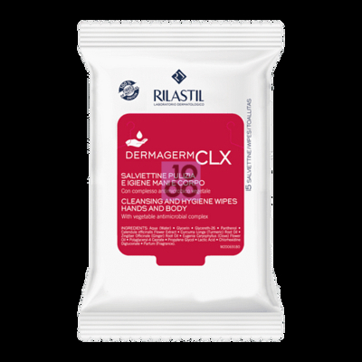 Rilastil Dermagerm CLX Salviettine Descrizione Salviettine igienizzanti a p H eudermico per l'igiene fuori casa di mani, corpo e superfici. Non seccano la pelle. 100 % fibre di origini naturali. Componenti Aqua (water), glycerin, glycereth-26, panthenol, Calendula officinalis flower extract, Curcuma longa (turmeric) root oil, Zingiber officinale (ginger) root oil, Eugenia caryophyllus (clove) flower oil, polyglyceryl-4 caprate, propylene glycol, lactic acid, chlorhexidine digluconate, parfum (fragrance). Formato Confezione da 15 salviettine. Cod. I45V08420