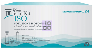 Rinoterm Kit ISO SOLUZIONE ISOTONICA Descrizione Dispositivo medico composto da una soluzione isotonica a base di acqua termale salsobromoiodica del bacino idrogeologico appenninico italiano ed una siringa con l'apposito ugello Rin Aqua per l'irrigazione nasale. Grazie alle loro caratteristiche saline, le acque salsobromoiodiche riequilibrano naturalmente le condizioni fisiologiche delle mucose e rappresentano, sia per il bambino che per l'adulto, il mezzo più utile per un'azione decongestionante e umettante all'interno delle narici. Indicato per la detersione e corretta igiene delle cavità nasali, per favorire la fluidificazione e la rimozione meccanica del muco, per idratare le mucose nasali e come coadiuvante nel trattamento delle riniti acute e croniche. Inoltre è indicato per l'igiene nasale"idiana attraverso l'utilizzo della siringa con l'apposito ugello Rin Acqua che permette un'efficacia e sicura applicazione. La forma conica dell'ugello, realizzata con materiale morbido e non poroso, consente la tenuta sulla narice, adattandosi in modo ergonomico sia ad adulti che a bambini. Componenti Acqua termale salsobromoiodica, potassio fosfato monofasico e bifasico, acqua. Modalità d'uso Lavarsi le mani prima e dopo l'uso del dispositivo. Aprire il flaconcino ruotando le alette. Collegare il flaconcino alla siringa e aspirare la soluzione contenuta all'interno del flaconcino. Fissare l'ugello Rin Aqua alla siringa. Tenere la testa del bambino reclinata da un lato (nel caso di bambini molto piccoli, sdraiarli sostenendo il capo con una mano). Inserire la punta dell'ugello Rin Aqua in una narice ed effettuare l'irrigazione. Ripetere l'operazione reclinando la testa del bambino dall'altro lato per rendere accessibile l'altra narice. Rialzare la testa ed asciugare delicatamente il liquido in eccesso. Scollegare l'ugello Rin Aqua dalla siringa e infine lavarlo. Nebulizzare 1-2 flaconcini al dì da suddividere nelle due narici. I flaconcini sono richiudibili. La durata d'uso può dipendere dalla condizione dei sintomi e quindi prevedere un periodo prolungato. Pulizia: il dispositivo medico RINO TERM KIT ISO (composto da siringa e ugello Rin Aqua per la nebulizzazione) è indicato per l'uso da parte di un solo paziente, ma può essere utilizzato più volte. Effettuare un'attenta pulizia dopo ogni utilizzo, al fine di assicurarne la durata e il buon funzionamento. Lavare il dispositivo con acqua corrente tiepida e, prima di riportlo, asciugarlo accuratamente con un panno morbido o un getto d'aria calda. Avvertenze Prima dell'utilizzo, leggere attentamente il foglietto illustrativo. In caso di reazioni avverse, interrompere il trattamento e consultare il medico. Non utilizzare in caso di ipersensibilità verso i componenti. Tenere lontano dalla portata e dalla vita dei bambini. La presenza di sostanze naturali può far variare le caratteristiche organolettiche del prodotto senza che questo ne comprometta la qualità Evitare il contatto con gli occhi. Non iniettabile. Non utilizzare in caso di flaconcini parzialmente aperti o danneggiati. Conservazione Conservare in luogo fresco e asciutto e al riparo da fonti di luce diretta e fonti di calore. Dopo l'apertura, conservare in frigorifero. La data di scadenza indicata sulla confezione si riferisce al prodotto correttamente conservato, in confezione integra. Validità post-apertura: 24 ore. Formato Kit contenente: