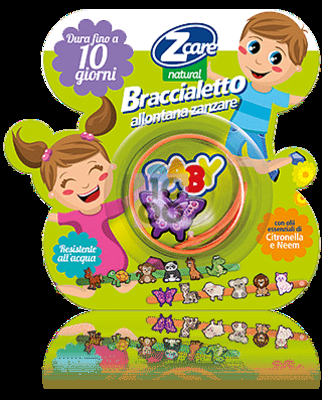 Zcare natural Braccialetto allontana zanzare BABY Descrizione Braccialetto allontana zanzare a base di oli essenziali. Grazie a un processo di termofusione il prodotto rilascia una profumazione graduale all'essenza di Citronella e Neem. Il prodotto è naturale, resistente all'acqua, con chiusura regolabile per polso o caviglia. Dura fino a 10 giorni. Formato Confezione blister richiudibile salvafragranza da 1 pezzo. Cod. 77465