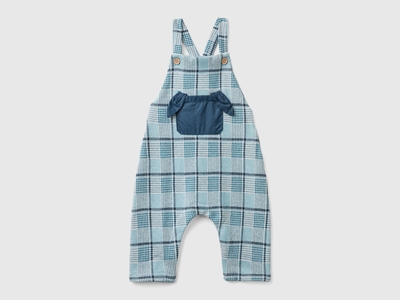 Salopette in morbido tessuto jacquard di puro cotone con fantasia a quadri principe di Galles. Bretelle fisse con bottoni effetto legno, taschino applicato davanti con orecchie in nylon. Apertura nascosta con bottoni a pressione sul cavallo. Perfetta da indossare sopra una t-shirt. Articolo realizzato con materiale contenente il 100% di fibre riciclate (55% poliestere 45% cotone)