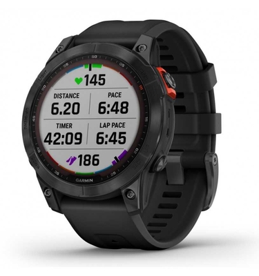 Garmin Fenix 7 010-02540-11 Smartwatch multisport testato secondo gli standard militari statunitensi per resistenza termica, agli urti e all'acqua. Cassa rotonda in polimeri fibrorinforzati dal diametro di 47 mm. Lunetta e fondello in acciaio nero. Ha display transflettivo a colori da 1, 3'' con risoluzione 260 x 260 pixel touchscreen. Lente Power Glass™ per ricarica solare. Fondello con cardiofrequenzimetro da polso di quarta generazione. Cinturino quick release in silicone nero largo 22 mm; chiusura con fibbia ardiglione. Resistente all'acqua fino a 100 metri di profondità.GPS integrato e sistemi Glonass & Galileo; sensori di altimetro, bussola, giroscopio, accelerometro e termometro. Possibilità di scaricare le mappe Topo Active di tutto il mondo. Diverse le funzioni di monitoraggio della salute. Tra queste: misurazione costante della frequenza cardiaca con report a riposo e sulle anomalie, saturazione nel sangue, monitoring del sonno e dello stress, idratazione. Connettività Bluetooth®, Wifi® e ANT®. Compatibile con app Garmin Connect con android e i OS per permettere configurazione SYNC. Consente pagamento contactless con Garmin Pay™. Notifiche dello smartphone. Datario, meteo, funzione "find my phone". Numerose le funzioni fitness con allenamenti preimpostati e personalizzabili per molti sport. Memoria, analisi e metriche degli allenamenti migliorate. Batteria dalla durata di circa 18 / 22 giorni in modalità smartwatch con ricarica solare attiva; 57 / 73 ore in modalità GPS.