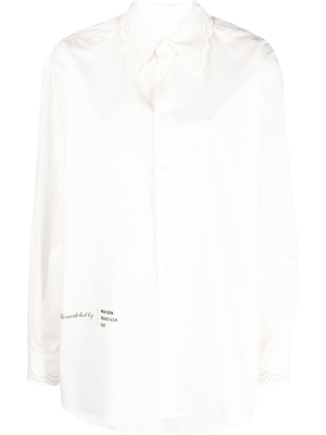 Camicia bianca MM6 Maison Margiela a maniche lunghe in cotone con colletto classico, logo nero laterale, chiusura frontale con bottoni e orlo curvo.