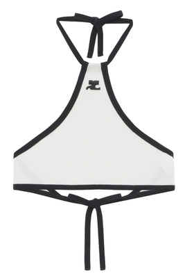 Crop top bianco Light Ribs di Courregès in cotone con laccio intorno al collo, dettagli neri a contrato e logo frontale.