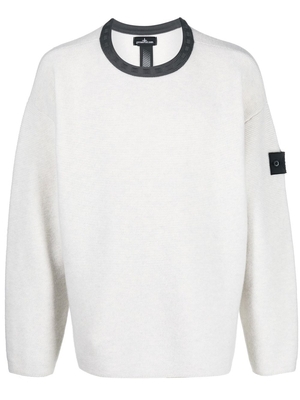 Maglione bianco 5042U di Stone Island Shadow Project in lana con girocollo a costrasto, logo sulla manica e orlo e polsini a costine.