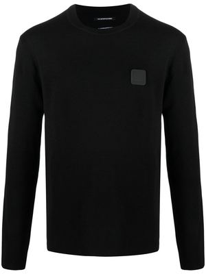 Maglione nero C.P. Company in misto lana con girocollo, applicazione con logo sul petto, maglia fine e orlo dritto.