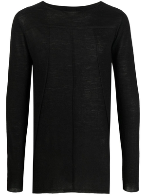 Maglione nero Rick Owens in lana vergine con maglia fine, girocollo, cuciture a contrasto e orlo dritto.