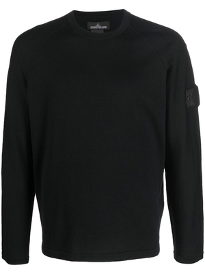 Maglione nero Stone Island Shadow Project in misto seta e cashmere con girocollo, logo sulla manica e orlo dritto.