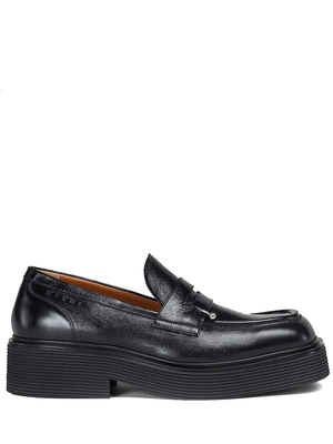 Mocassini neri Marni in pelle di vitello con punta squadrata, design senza apertura, piercing in metallo sulla linguetta e logo laterale in rilievo.