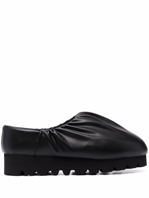 Sandali neri da donna Camp Shoe Low di Yume Yume in pelle vegana con punta tonda, arricciature frontali, design senza aperture e suola platform in gomma.