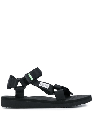 Sandali neri unisex Depa-Cab di Suicoke con punta aperta, chiusura con strappo, dettagli in metallo, etichetta con logo laterale e suola in gomma.