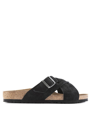 Sandali neri Lugano Desert di Birkenstock in pelle scamosciata con punta aperta, design intrecciato, fibbia regolabile in metallo e suola ergonomica.