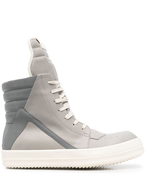 Sneakers grigie Geobasket di Rick Owens in pelle con punta tonda, chiusura frontale con lacci bianchi, altezza alla caviglia e suola piatta in gomma.
