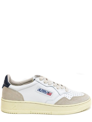 Sneakers bianche da donna Medalist Aulw LS28 di Autry in pelle con dettaglio posteriore blu navy, chiusura frontale con lacci bianchi, logo laterale e suola piatta in gomma.