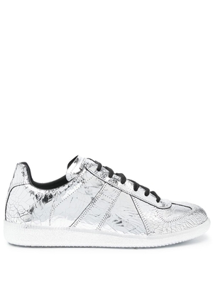Sneakers argento Replica di Maison Margiela in pelle con punta tonda, chiusura frontale con lacci neri e suola piatta in gomma.