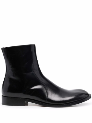 Stivaletto nero Maison Margiela in pelle con punta tonda, chiusura con zip laterale, finitura lucida e altezza alla caviglia.
