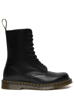 Stivali neri da donna 1490 Smooth di Dr. Martens in pelle con punta tonda, iconiche cuciture gialle, linguetta logo posteriore, chiusura con lacci e altezza sopra la caviglia.