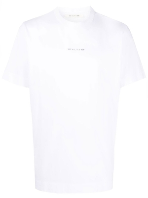 T-shirt bianca Sphere Logo di 1017 Alyx 9SM a maniche corte in cotone con girocollo, logo nero stampato sul petto, stampa sul retro e orlo dritto.