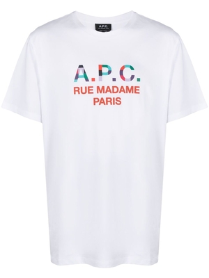 T-shirt bianca Tao di A.P.C. a maniche corte in cotone con girocollo, logo multicolore stampato sul petto e orlo dritto.