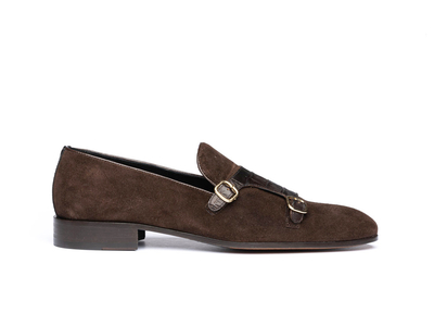 Doppia fibbia scamosciato cocco testa di moro, fatta a mano e personalizzabile, made in Italy.