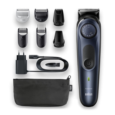 Crea il tuo stile in tutta semplicità con il regolabarba uomo e tagliacapelli Braun BT7. Questo regolabarba è più affilato, veloce ed efficiente, con un?area di taglio più ampia per catturare e tagliare più peli a ogni passata. Il regolabarba 7 è dotato di un selettore di precisione con 39 impostazioni di lunghezza, lame affilate in metallo di lunga durata e batteria Li-Ion. i pettini e la testina del rifinitore sono lavabili.