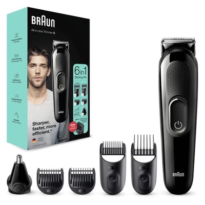 Padroneggia il tuo stile con la massima precisione con il rifinitore ricaricabile mgk 3 6-in-1. Questo regolabarba uomo è più affilato, veloce ed efficace, con una testina di taglio più ampia per catturare e tagliare più peli a ogni passata*. mgk 3 offre 13 lunghezze (da 0, 5 a 21 mm) e lame affilate di lunga durata per ottenere facilmente il look desiderato su barba e capelli. *rispetto ai precedenti rifinitori Braun La confezione comprende: 1 rifinitore barba e capelli 1 rifinitore naso e orecchie 4 accessori a pettine 1 spazzolina di pulizia 1 alimentatore intelligente 1 manuale di Istruzioni