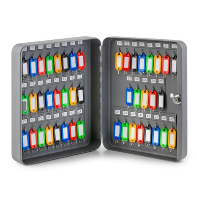- 45 POSTICassetta portachiavi realizzata in robusto acciaio verniciato con polveri epossidiche. Serratura a cilindro nichelato, completa di n.2 chiavi. Fornite con adesivi numerati, portachiavi (colori assortiti) e 2 tasselli per fissaggio a parete.