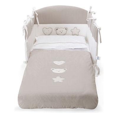 Rivestimento in 100% cotone con interno in  bra di poliestere arricchito da tessuto stampato personalizzato ed applicazioni in tessuto ricamato. Il set comprende: paracolpi sagomato, piumone s labile (cm 75x 125) con copripiumone e federa cuscino (cm 60x 4