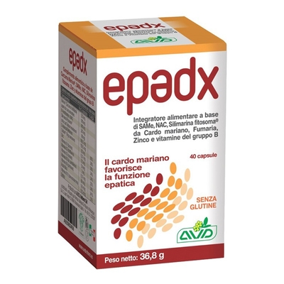 Epadx Descrizione Integratore alimentare a base di SAMe, NAC, silimarina fitosoma da cardo mariano, fumaria, zinco e vitamine del gruppo B, utile nel favorire la funzionalità epatica. Ingredienti N-acetil cisteina (NAC), Silimarina Fitosoma (Silybum marianum L. Gaertn frutti e.s. tit. in silimarina; lectina di soia), fumaria (Fumaria officinalis L.) parti aeree e.s. tit. 0, 04% in protopina, SAMe (S-adenosil-metionina), Cultavit [complesso vegetale di vitamine del gruppo B da grano saraceno (Fagopyrum esculentun Moench) frutto intero], zinco gluconato; antiagglomeranti: calcio fosfato, silice micronizzata, magnesio stearato; capsula vegetale: idrossipropilmetilcellulosa, titanio biossido Senza glutine Caratteristiche nutrizionali Valori medi Per 2 capsule%VNR* N-acetilcisteina (NAC)400 mg- Silimarina fitosoma di cui cardo mariano 400 mg 132 mg- - Fumaria e.s.200 mg- S-adenosil-metionina (SAME) 200 mg- Cultavit (grano saraceno)150, 5 mg- Zinco 10, 0 mg 100 Vitamina B1 (tiamina)0, 31...