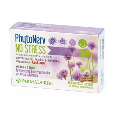 PHYTONERV NO STRESS Descrizione Integratore alimentare a base di magnesio, withania, tiglio, L-teanina, acido folico e Lactium, proteine del latte idrolizzate. La withania favorisce il rilassamento ed il benessere mentale e risulta utile per il suo effetto tonico- adattogeno e tonico in caso di stanchezza fisica e mentale. Il tiglio contribuisce al rilassamento in caso di sonno e stress. Il magnesio e l'acido folico contribuiscono alla riduzione della stanchezza e dell'affaticamento. Lactium è una proteina del latte idrolizzata contenente un decapeptide attivo ottenuto tramite digestione enzimatica. Ingredienti Agenti di carica: cellulosa microcristallina, fosfato dicalcico; magnesio idrossido, magnesio ossido, Lactium proteine del latte idrolizzate (derivato del latte), whitania (Whitania somnifera L. Dunal) radice e.s. tit. 32, 5% whitanolidi, tiglio (Tilia platyphyllos Scop.) fiori e.s., acido stearico, agenti antiagglomeranti: biossido di silico, carbossimetilcellulosa sodica...
