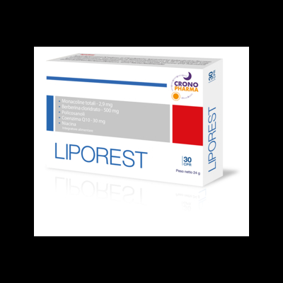 LIPOREST Descrizione Integratore alimentare a base di berberina, riso rosso fermentato da Monascus purpureus, coenzima Q10, policosanoli e niacina utile nei casi di ridotto apporto con la dieta o di aumentato fabbisogno di questi nutrienti. Ingredienti Berberis (Berberis aristata DC) radice e.s. tit. 97% in berberina; agente di carica: fosfato di calcio; riso rosso fermentato (Oryza sativa L., seme fermentato da Monascus purpureus) e.s. tit. 3% in monacoline totali; agenti antiagglomeranti: polivinilpirrolidone, magnesio stearato vegetale; coenzima Q10, policosanoli da canna da zucchero (Saccharum officinarum L., succo), niacina (nicotinamide). Caratteristiche nutrizionali Valori medi per 1 compressa Berberina cloridrato 500 mg Riso rosso pari a monacoline totali 95 mg 2, 85 mg Coenzima Q10 30 mg Policosanoli 15 mg Niacina 10 mg (62, 5% VNR*) *VNR: Valori Nutritivi di Riferimento Modalità d'uso Assumere 1 compressa al giorno da deglutire con acqua durante o sub...