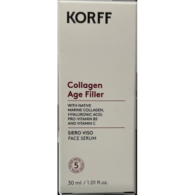 Korff Collagen Age Filler siero riduce le rughe, dona tonicità e compattezza alla pelle, la illumina e la mantiene idratata, a base di Collagene marino, vitamine e Acido ialuronico. Formato: vasetto da 30 ml. Korff Collagen Age Filler siero antirughe a base di vitamina C e B5, Collagene marino, acido ialuronico. La sua formulazione, con Age Filler Complex riduce le rughe donando tonicità e compattezza alla pelle, la illumina e la mantiene idratata, adatta a tutti i tipi di pelle, ideale anche dopo trattamento di medicina estetica post-acta. Dermatologicamente testato, senza nichel, cobalto, mercurio, piombo, palladio e cromo. MODALITA' D'USO Applicare il prodotto mattina e sera sul viso e massaggiare delicatamente fino a completo assorbimento. Evita il contatto con gli occhi. COMPONENTI Aqua (Water), Propane- diol, Panthenol, Isopentyldiol, C12-13 Pareth-9, Glycerin, 1, 2-Hexanediol, Pentylene Glycol, Soluble Collagen, Nia- cinamide, Sodium Hyaluronate, Ascorbyl Glucoside, Faex Ex...