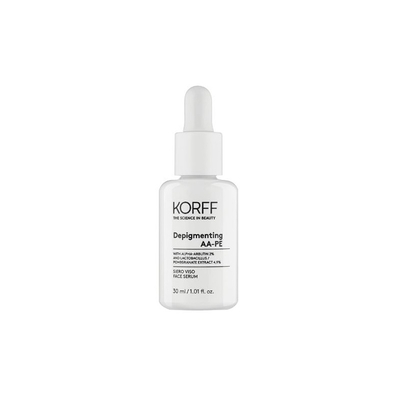 Korff Depigmenting AA-PE è un trattamento urto intensivo per la correzione dell'iperpigmentazione cutanea e riduce la profondità delle rughe in 4 settimane. Formato: flaconcino da 30 ml. Korff Depigmenting AA-PE è un trattamento urto intensivo per la correzione dell'iperpigmentazione cutanea formulato con il 2% di alfa-arbutin e il 4, 9% di Lactobacillus/pomegranate extract che: Riduce efficacemente le macchie; Migliora la luminosità della pelle; Riduce la profondità delle rughe in 4 settimane. Caratteristiche Clinicamente e dermatologicamente testato; E' Nichel tested. Adatto per In caso di iperpigmentazione sul viso. Destinazione d'uso Viso. Modalità d'uso Applicare mattina e/o sera sul viso perfettamente deterso e asciutto. Ingredienti Aqua (water), butylene glycol, Lactobacillus/ Punica granatum fruit ferment extract, glycereth-26, alfa-arbutin, glycerin, C12-13 pareth-9, Sigesbeckia orientalis extract, Chondrus crispus (carrageenan) powder, Rabdosia rubescens extract, lact...