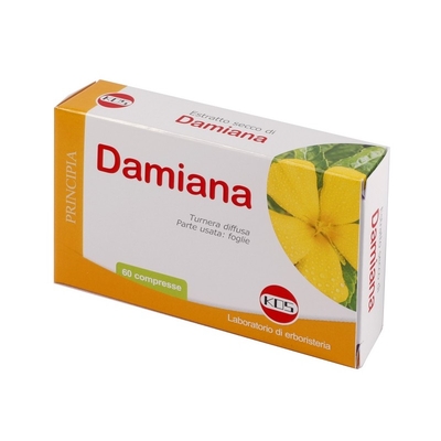 Damiana Descrizione Integratore alimentare. Effetti fisiologici di damiana foglie: tonico (stanchezza fisica e mentale). Ingredienti Damiana (Turnera diffusa Willd. ex Schult.) foglie e.s. (rapporto estratto/droga 1:4) su maltodestrine da mais; agente di carica: cellulosa microcristallina; antiagglomeranti: magnesio stearato vegetale; bamboo (Bambusa bambos L. Voss) giovani fusti e.s. al 70% di silice. Caratteristiche nutrizionali Valori medi per compressa Damiana foglie e.s.400 mg Modalità d'uso Assumere 2-3 compresse al giorno, preferibilmente lontano dai pasti. Avvertenze Il prodotto va utilizzato nell'ambito di una dieta variata ed equilibrata seguendo uno stile di vita sano. Non superare la dose giornaliera raccomandata. Tenere fuori dalla portata dei bambini al di sotto dei 3 anni. Conservazione Conservare al riparo da luce e umidità. Validità a confezione integra: 36 mesi. Formato Blister da 60 compresse. Peso netto: 30 g.