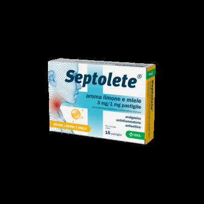Le pastiglie Septolete svolgono un'azione antisettica e antinfiammatoria che allevia il fastidio del mal di gola contrastando l'infiammazione Formato: 16 bastiglie gusto limone e miele Septolete aroma limone e miele 3 mg/1 mg pastiglie Benzidamina cloridrato/cetilpiridinio cloruro Che cos'è e a che cosa serve Septolete aroma limone e miele contiene la sostanza attiva benzidamina cloridrato e cloruro di cetilpiridina. Septolete aroma limone e miele pastiglia è un medicinale antinfiammatorio, analgesico e antisettico per uso orale locale. Septolete aroma limone e miele disinfetta la bocca e la gola e riduce i segni di infiammazione della gola come dolore, arrossamento, gonfiore, calore e funzione alterata. Septolete aroma limone e miele è usato per il trattamento dei sintomi di gola infiammata associata a lievi infezioni della bocca e della gola (incluse gengivite e faringite). Si deve rivolgere al medico se non si sente meglio o se si sente peggio dopo 3 giorni. Cosa deve sapere...