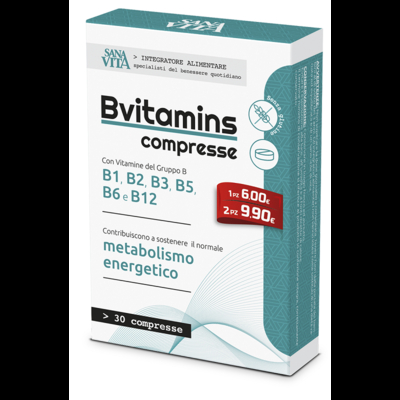 Bvitamins Descrizione Integratore alimentare a base di vitamina B. All'interno si trova il complesso vitaminico del gruppo B, la cui integrazione può risultare utile in caso di aumentato fabbisogno, stress, carichi eccessivi, alimentazione scorretta o monotona, convalescenza. Ingredienti Agenti di carica: cellulosa, fosfato dicalcico; nicotinamide (niacina); agenti antiagglomeranti: sali di magnesio degli acidi grassi, biossido di silicio; calcio D-pantotenato (acido pantotenico), cloridrato di piridossina (vitamina B6), riboflavina (vitamina B2), cloridrato di tiamina (vitamina B1), acido pteroil-monoglutammico (acido folico), D-biotina, cianocobalamina (vitamina B12). Senza glutine. Caratteristiche nutrizionali Valori medi per dose giornaliera (1 compressa) %VNR* Tiamina (vitamina B1) 1, 32 mg 120 Riboflavina (vitamina B2) 2, 1 mg 150 Vitamina B6 2, 1 mg 150 Vitamina B12 3, 75 mcg 150 Acido pantotenico (vitamina B5) 9 mg 150 Niacina 19, 2 mg 120 Acido fol...
