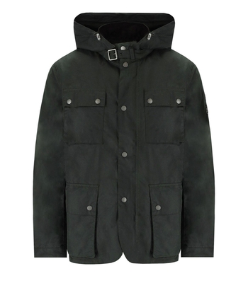 Barbour Intl's Auto Wax jacket is made from sage green waxed cotton. It features front flap pockets, a high collar with an adjustable strap, & a detachable hood, adjustable with a drawstring. The interior is made from quilted nylon, with a logo patch on the left sleeve. It has a back slit & side buttons for adjusting the fit. It fastens with a zip & buttons. Composition: 100% waxed cotton. Interior: 100% polyamide.