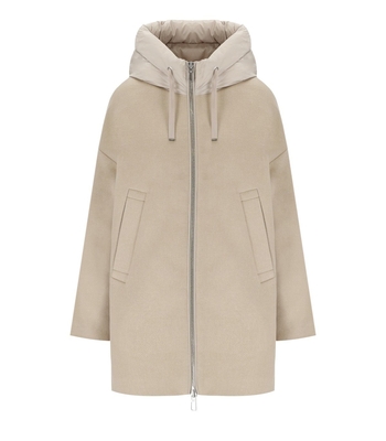 Mayu jacket by Duno made of a wool-cashmere blend in a beige color. Characterized by a double-slider zip closure, it features a cape design finished with wide sleeves and flap side pockets. With dropped shoulders, it has side openings with snaps. Equipped with a nylon hood, adjustable with a drawstring. Regular fit. Composition: 45% wool, 30% elastane, 22% polyamide, 3% cashmere. Padding: 90% duck down, 10% feathers.