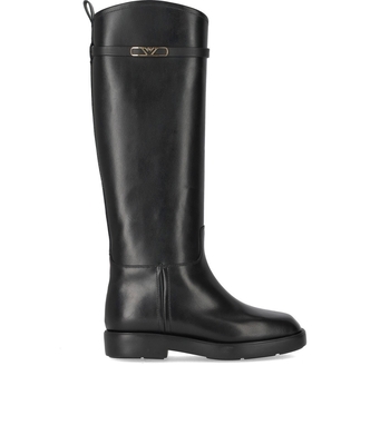 High boot by Emporio Armani made from calfskin in black. Characterized by a riding structure, it has a rounded toe. It features a branded strap at the height of the shoe's opening. Rubber sole, height 3 cm.