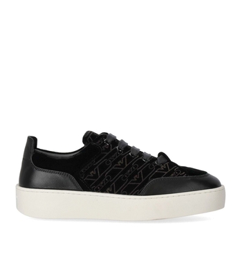 Sneaker by Emporio Armani made of black velvet, with monogram pattern and leather inserts. Fabric lining and leather insole. Black cotton laces, white rubber sole. Height 3.5 cm. Upper composition: 65% viscose, 35% cupro. Inserts: 100% bovine leather. Main lining: 100% polyester. Secondary lining: 100% bovine leather. Sole: 100% thermoplastic rubber.