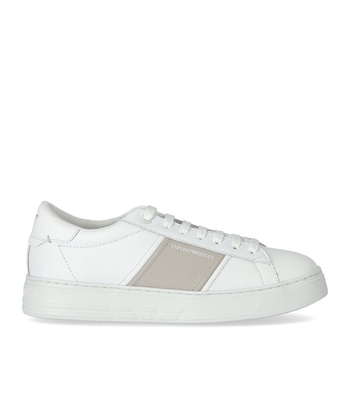 Emporio Armani sneakers made from white leather. Beige hammered leather side band with contrasting logo, padded mesh tongue, lining & insole in technical fabric. White rubber sole, height 3.5 cm.