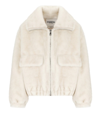 Genz bomber jacket by Essentiel Antwerp made from ecru synthetic faux fur fabric. Characterized by a soft silhouette accentuated by the hem & cuffs, it features an elegant collar. Zip closure. Front slit pockets & dropped shoulders. Elastic hem. Oversized fit. Composition: 100% polyester.
