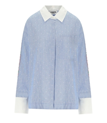 Harkle shirt by Essentiel Antwerp, made of cotton poplin, in shades of blue and white. Characterized by lightweight and non-stretch fabric, it features a button closure. Finished with embroidered details and flower-shaped beads along the long sleeves, it has dropped shoulders and a chest pocket. Equipped with a pointed preppy collar and classic cuffs with button closure. Rounded hem and longer hem at the back. Oversized fit. External composition: 100% cotton. Beads: 100% acrylic, 100% glass. Collar: 100% cotton. Embroidery: 100% polyester. Sequins: 100% glass.