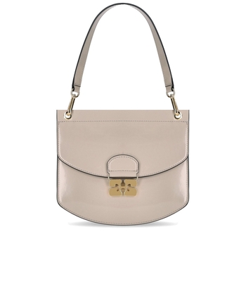 Ganni bag made from faux leather in shades of gray, with a glossy finish. Lined interior, magnetic closure with gold logo detail, interior divided into three compartments, one of which has a zipper. Adjustable & removable shoulder strap,