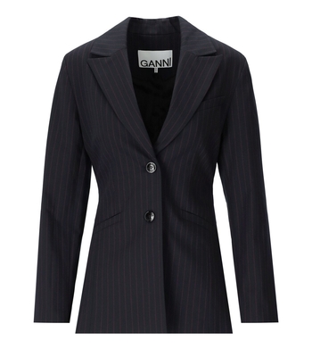 Ganni blazer made from blue viscose blend with contrasting pinstripe motif. Padded shoulders & single-breasted closure with logoed buttons. Polyester lining, slim fit.