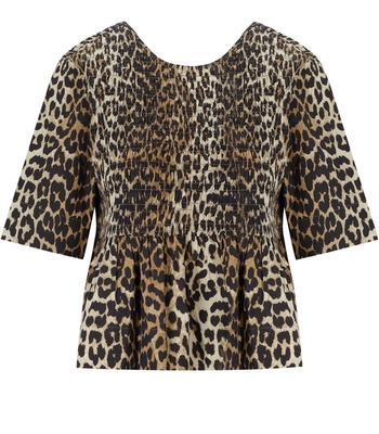 Ganni blouse made of organic cotton with leopard print in shades of brown and beige. Wide short sleeves, smock stitch on the bodice and back neckline. Soft fit.