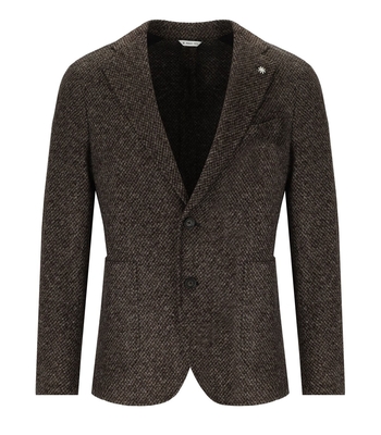 Manuel Ritz single-breasted jacket made in a wool blend with a salt and pepper pattern in shades of brown. Partially lined, it features applied pockets, vents on the back, and a lapel collar with a detachable logo pin. Button closure. Composition: 54% acrylic fiber, 24% virgin wool, 22% polyester. This item has a small fit; we recommend buying one size larger than your usual.