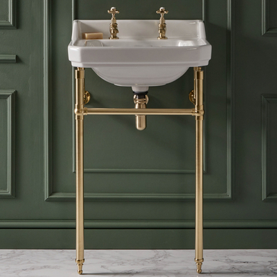 - può anche essere tagliato all'altezza desiderata per una maggiore comodità Dimensioni: L 560mm x P 450mm Lavabo in ceramica resistente con finitura in smalto bianco Consolle in acciaio inox con finitura oro satinato (richiede il montaggio) Due fori per la rubinetteria e troppopieno Portasalviette integrato Certificazione EN14688 Potrebbe essere necessario accorciare le dimensioni della consolle