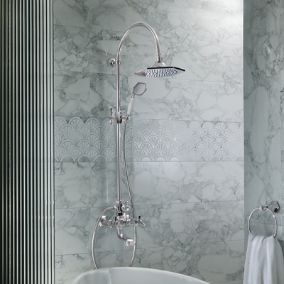 Crea un look elegante con il kit miscelatore per doccia da bagno Art Deco Earlham, completo di miscelatore per vasca da bagno a parete e asta saliscendi con soffione e doccetta con flessibile. Realizzato in ottone per una sensazione di lusso e una durata garantita, questo set miscelatore per doccia da bagno presenta un design in stile Art Deco e una brillante finitura cromata per un look tradizionale ma glamour. Il soffione della doccia fornisce una copertura di acqua effetto pioggia per un'esperienza di doccia rilassante e lenitiva, mentre la doccetta eroga uno spruzzo d'acqua rinfrescante. Abbinalo ad altri articoli della collezione Earlham per un bagno perfettamente coordinato. Caratteristiche: Dimensioni: L 254 mm x P 512 mm x H 1221 mm Design classico ed elegante Miscelatore a parete per vasca da bagno Il soffione doccia offre una copertura idrica di lusso Doccetta ad altezza regolabile con tubo flessibile da 1, 5 m Struttura in ottone massiccio con resistente finitura cromata La tecnologia...